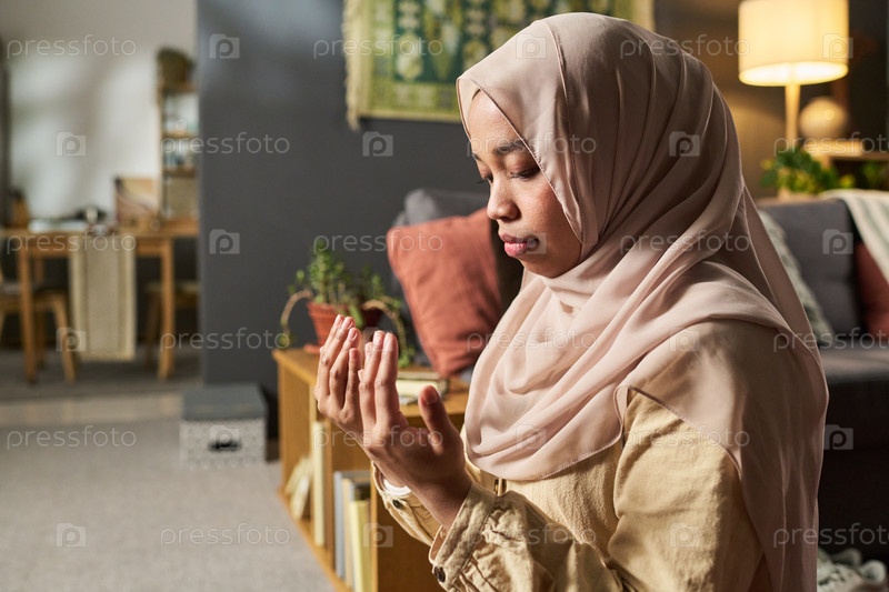 Молодая взрослая мусульманка молится в помещении с поднятыми руками во время созерцания