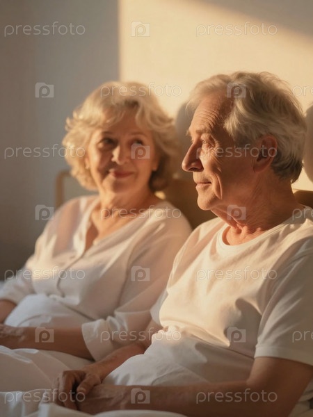 Пожилая пара сидит вместе в постели, наслаждаясь теплым солнечным днем.Они улыбаются друг другу и делятся моментом счастья в своем долгом браке Generative AI