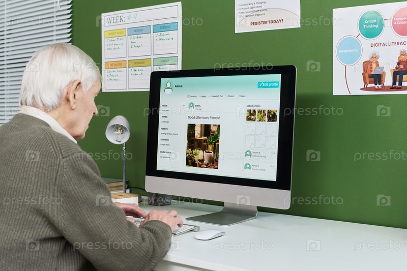 Старший кавказский мужчина практикует навыки социальных сетей во время урока компьютерной грамотности