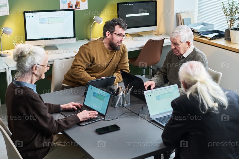 Мужчина среднего возраста преподает старшему кавказскому народу использование ноутбуков во время курса компьютерной грамотности