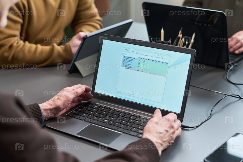 Старший кавказский мужчина обучается навыкам электронной таблицы во время курса компьютерной грамотности