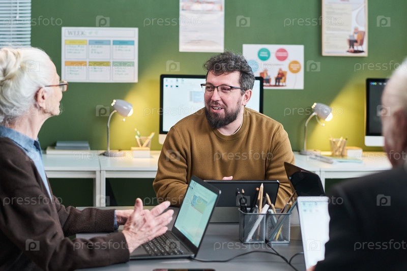 Кавказский мужчина среднего возраста преподает старшим студентам курс компьютерной грамотности