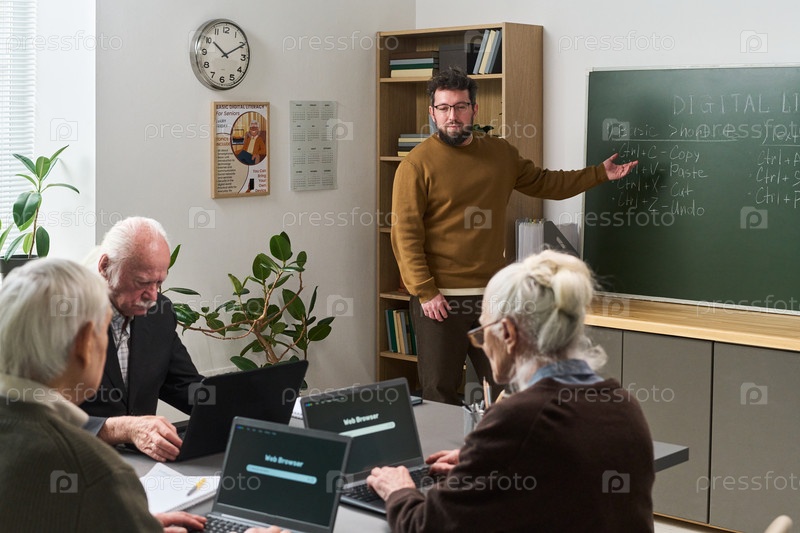 Кавказский мужчина среднего возраста преподает старшим взрослым курс компьютерной грамотности