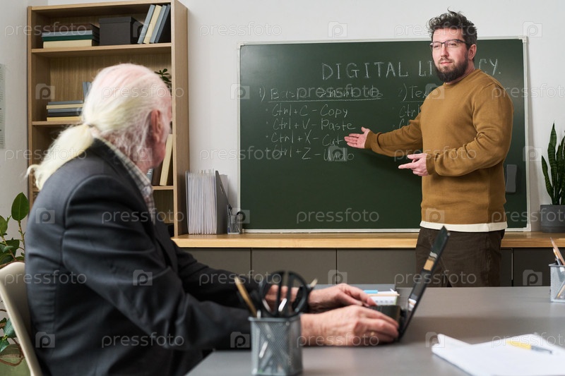 Молодой кавказский мужчина преподает старший курс компьютерной грамотности