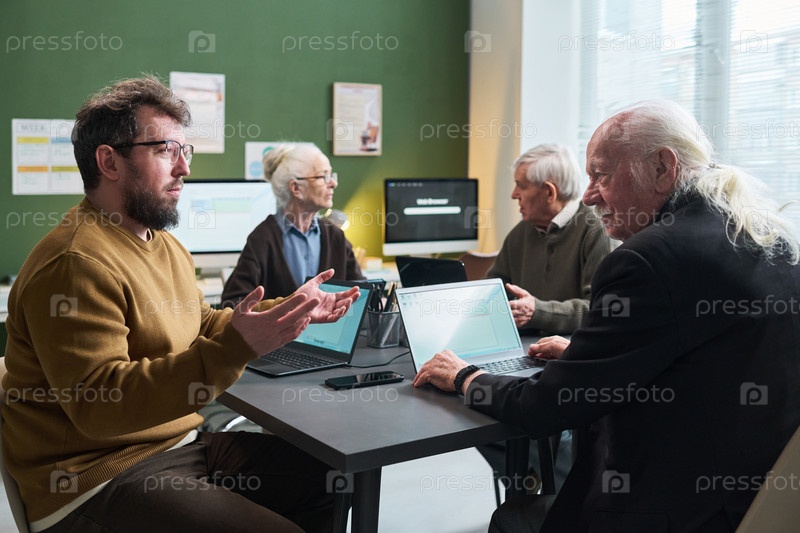 Кавказский мужчина средних лет руководит старшими белыми мужчинами и женщинами с помощью ноутбуков