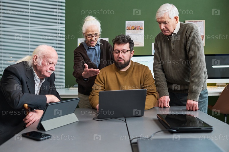 Кавказские мужчины и женщины сотрудничают с инструктором для молодых взрослых на старших ноутбуках