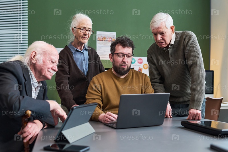 Молодой белый мужчина преподает курс компьютерной грамотности старшим белым людям