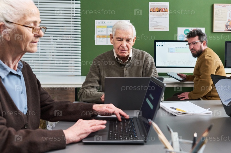 Кавказская женщина и мужчина-старший развивают навыки компьютерной грамотности на ноутбуках