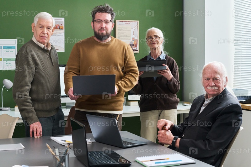 Портрет старших белых мужчин и женщин, участвующих в семинаре по цифровой грамотности