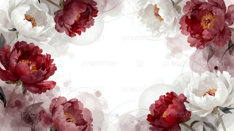 На светлом фоне показана группа красно-бургундских и белых пион.Цветы создают декоративную границу вокруг пустой центральной области Generative AI