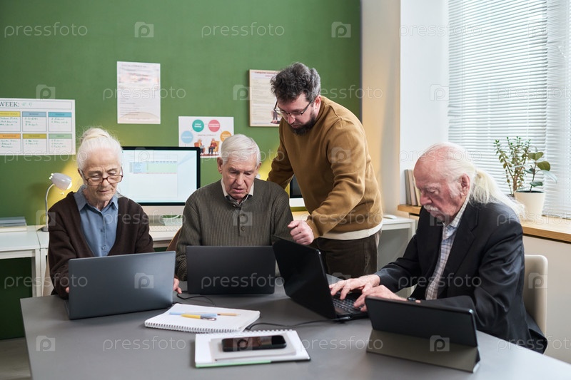 Кавказские мужчины и женщины обучаются компьютерным навыкам во время старшего курса грамотности