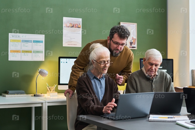 Кавказский мужчина средних лет обучает старшую кавказскую пару, используя ноутбуки