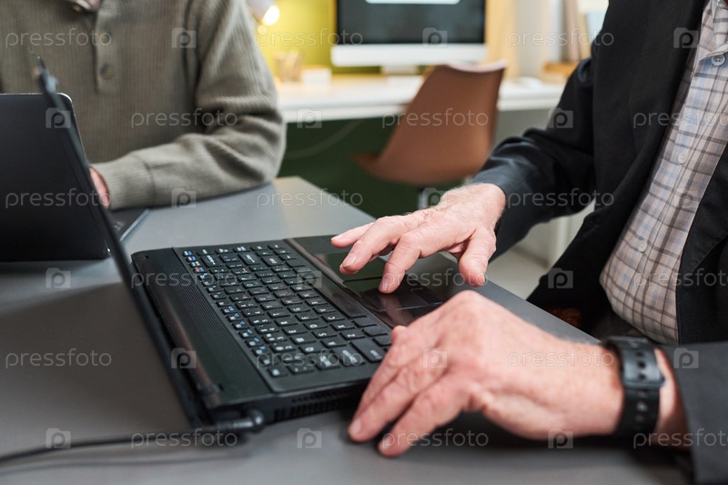 Старший кавказский мужчина посещает курс компьютерной грамотности с использованием ноутбука в помещении