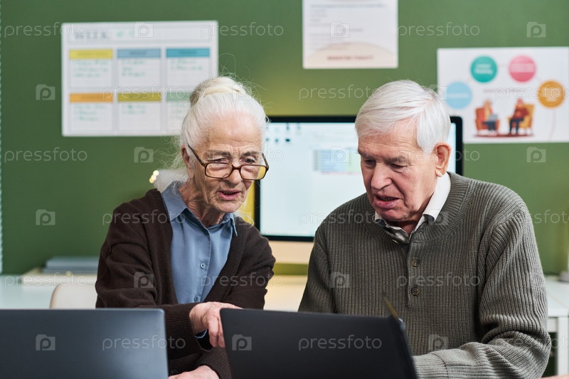 Старшая кавказская женщина преподает старшему кавказскому мужчине использование ноутбука во время курса