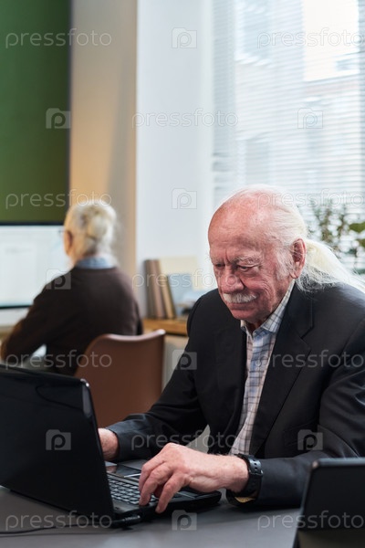 Старший кавказский мужчина посещает курс компьютерной грамотности с использованием ноутбука