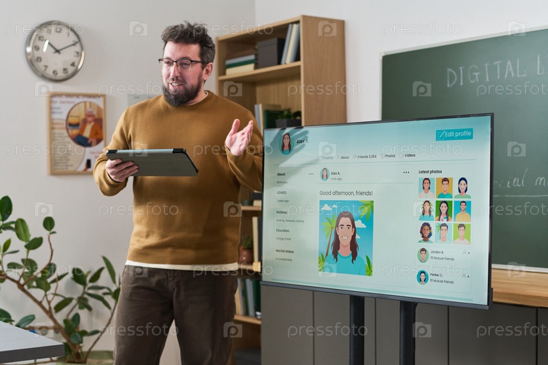 Кавказский молодой взрослый мужчина преподает курс компьютерной грамотности с помощью планшетного устройства