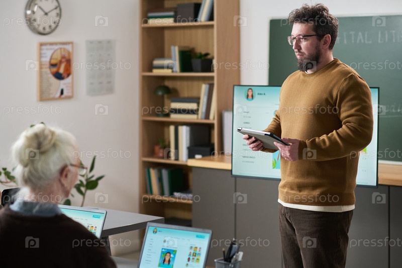 Кавказский мужчина среднего возраста преподает старшей женщине, используя цифровой планшет в классе