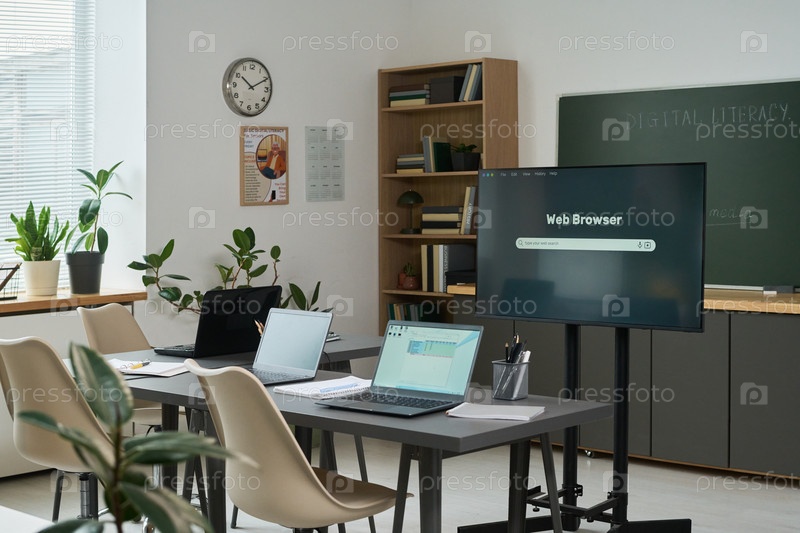 Пустой класс показывает ноутбуки и монитор во время курса компьютерной грамотности