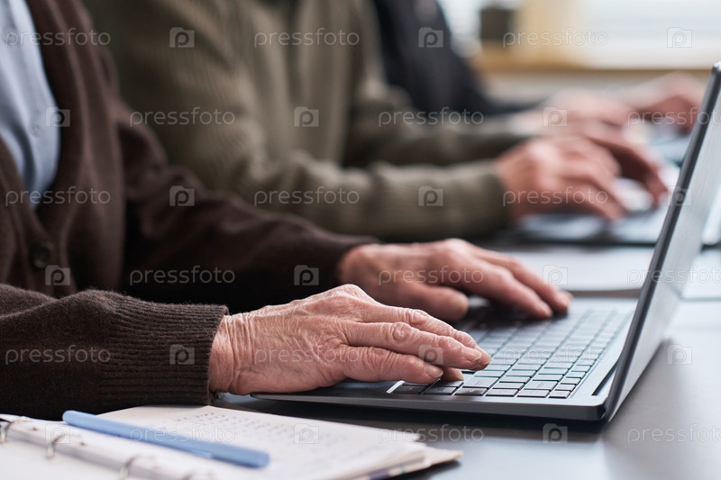 Старший кавказский мужчина посещает курс компьютерной грамотности с использованием клавиатуры ноутбука