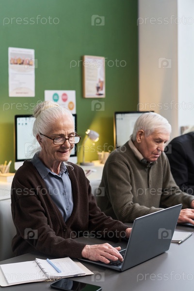 Старшая кавказская женщина практикует навыки печатания на ноутбуке во время компьютерного класса