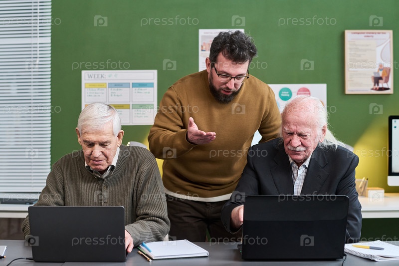 Белый мужчина средних лет учит старших белых мужчин использовать ноутбуки в классе