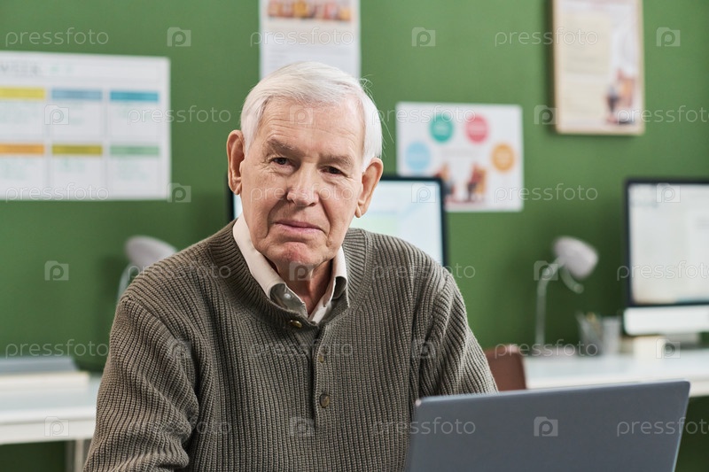 Портрет старшего белого мужчины, посещающего курс компьютерной грамотности в помещении