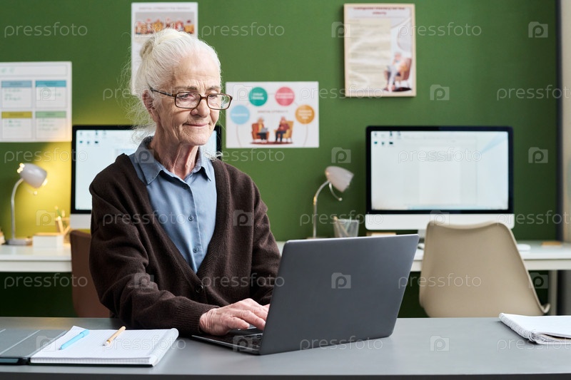 Старшая кавказская женщина посещает курс компьютерной грамотности с использованием ноутбука