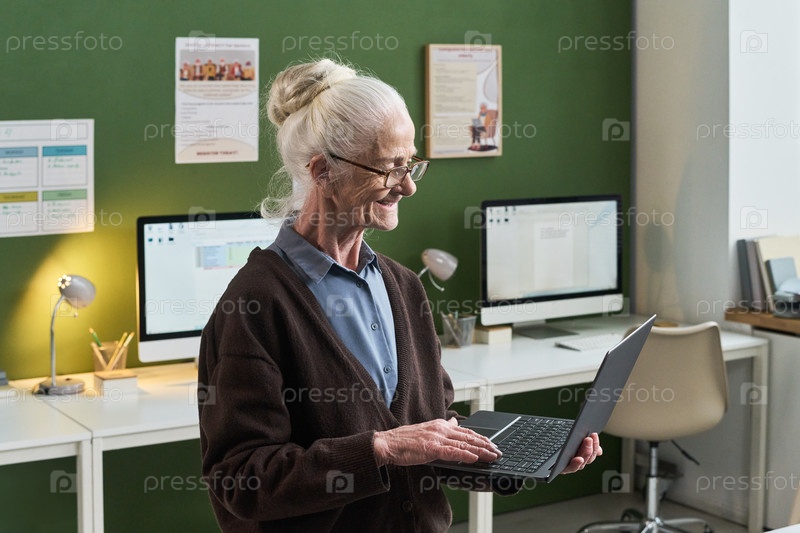 Старшая кавказская женщина практикует цифровые навыки, стоя с ноутбуком