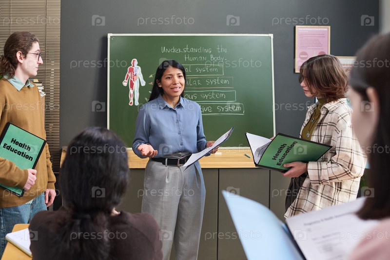 Молодые взрослые многоэтнические студенты обсуждают системы человеческого тела в классе
