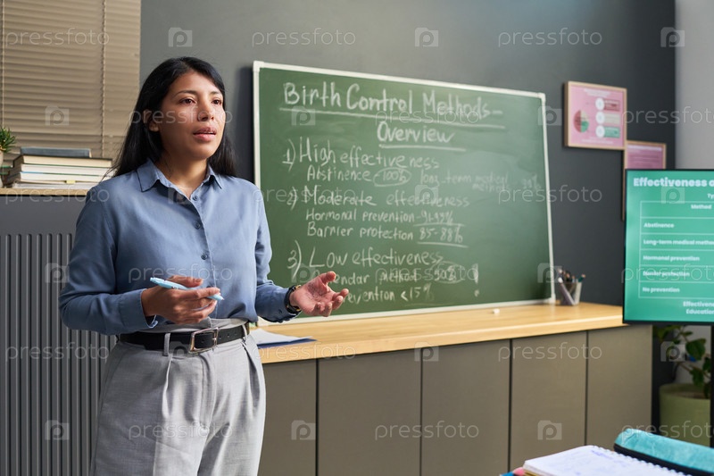 Молодая взрослая испаноязычная женщина объясняет методы контроля над рождаемостью в классе