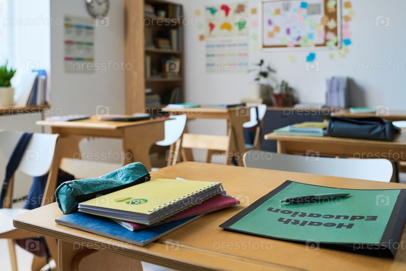 Пустой класс, показывающий столы с материалами для образования в области здравоохранения на столе