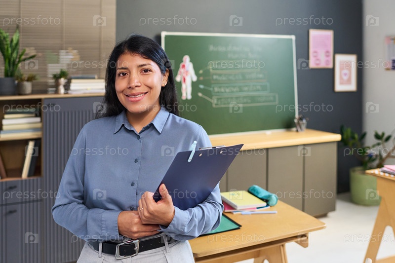 Портрет молодой взрослой испаноязычной женщины, улыбающейся в то время как она держит клипборд в классе