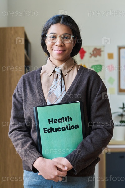 Портрет молодой взрослой чернокожей женщины, держащей папку "Образование здоровья" улыбаясь