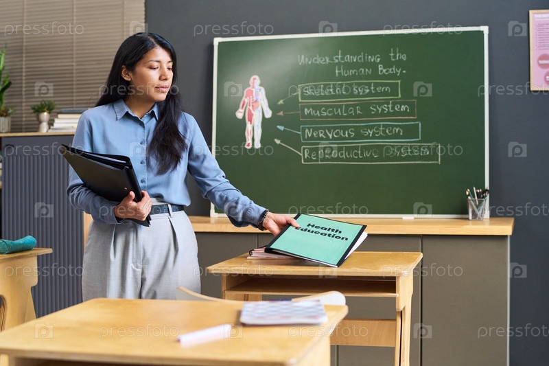 Молодая взрослая испаноязычная женщина преподает урок здравоохранения и образования в классе