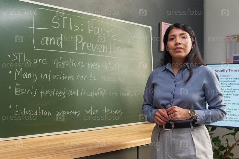 Портрет молодой взрослой испаноязычной женщины, преподающей профилактику ИППП в классе