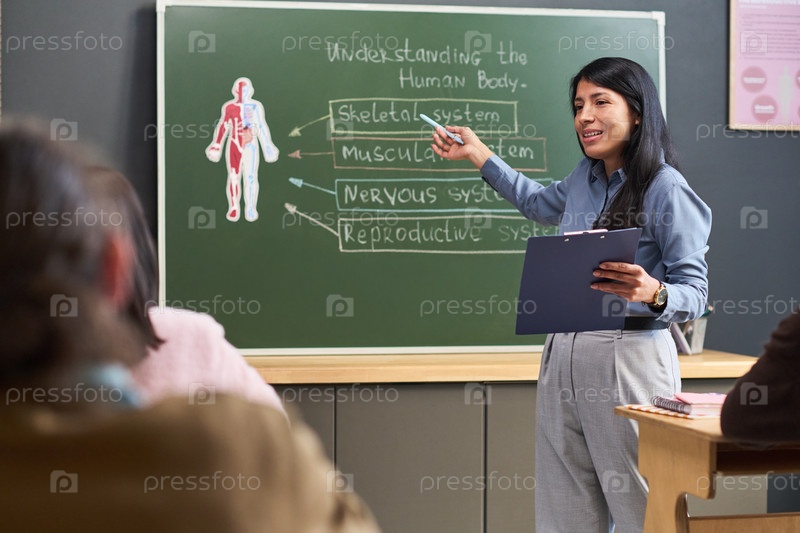 Молодая взрослая испаноязычная женщина преподает урок анатомии человека в классной обстановке