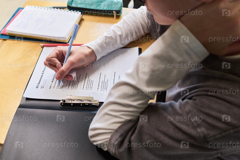 Подросток-кавказский мальчик пишет ответы на тесты в школьном столе