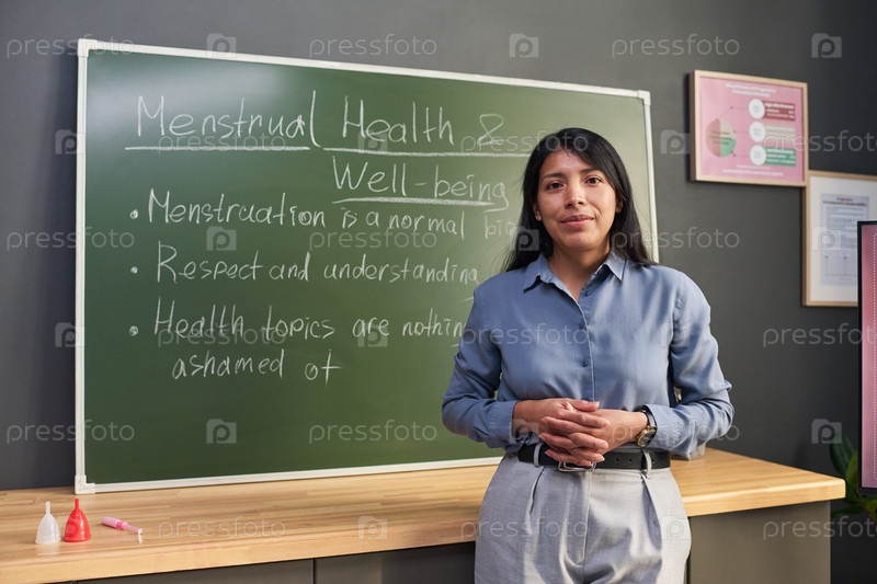 Портрет молодой взрослой испаноязычной женщины, преподающей осведомленность о менструальном здоровье