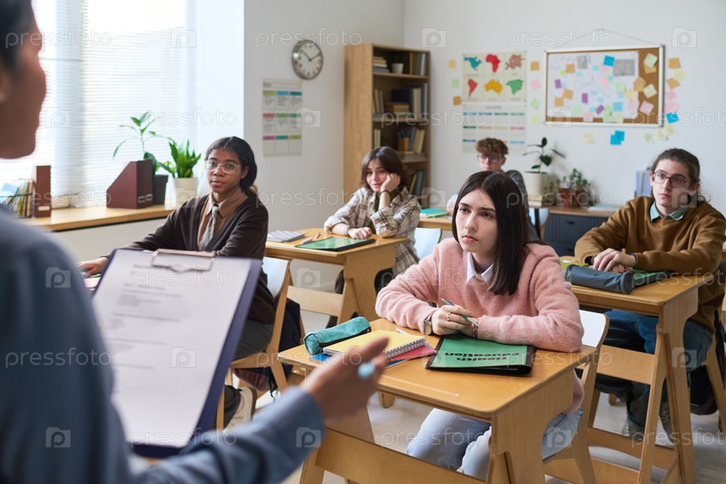 Разнообразная группа подростков внимательно слушает учителя в классе