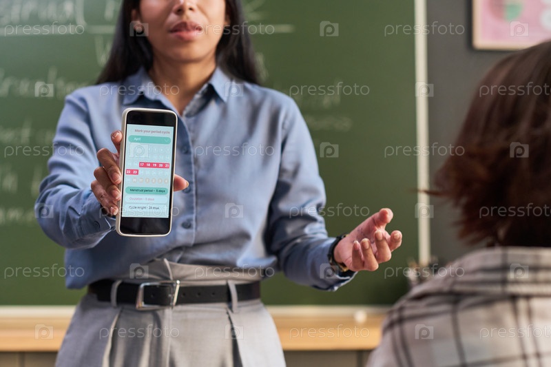 Средний участок женщины, показывающей студенту приложение для смартфона