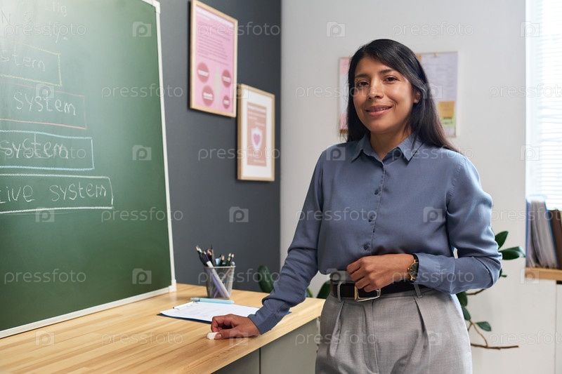 Портрет испаноязычной женщины, улыбающейся, стоящей возле доски