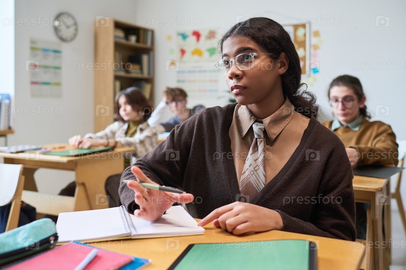 Черная девочка-подросток делает заметки во время урока в классе с сосредоточенным выражением