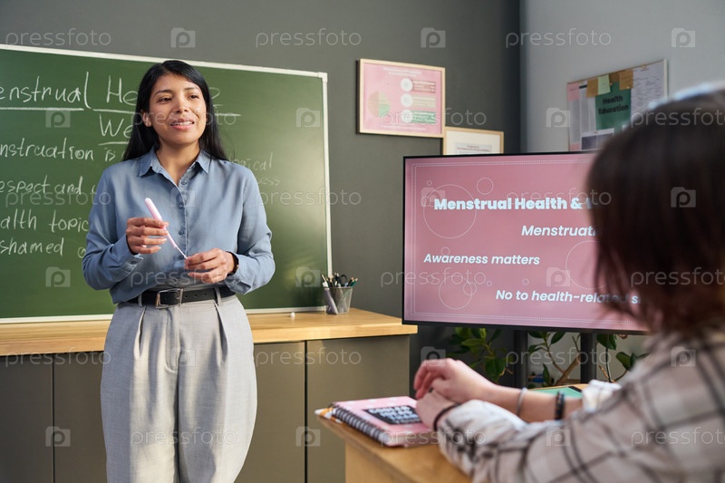 Испаноязычная женщина учит подросткам осведомленности о менструальном здоровье