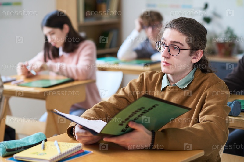 Кавказский мальчик-подросток изучает образовательные материалы, сидя в классе