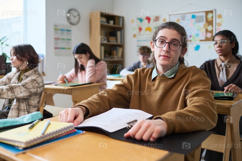 Портрет белого мальчика-подростка, сидящего за столом и изучающего в классе