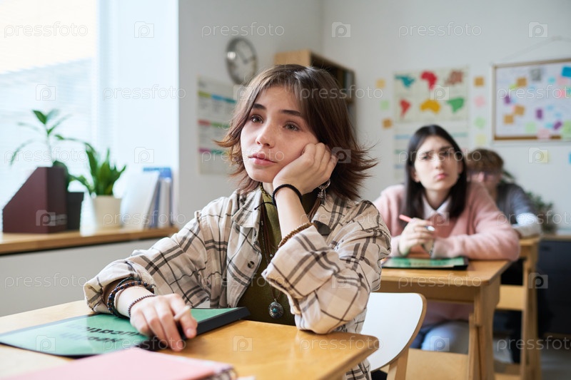 Кавказская девочка-подросток сидит за рабочим столом и выглядит скучно во время урока в классе