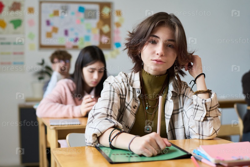 Портрет белокожей девочки-подростка, сидящей за рабочим столом и посещающей школьный урок