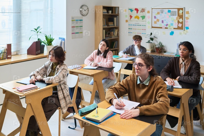 Разнообразная группа подростков, сидящих за столом и слушающих во время урока в классе