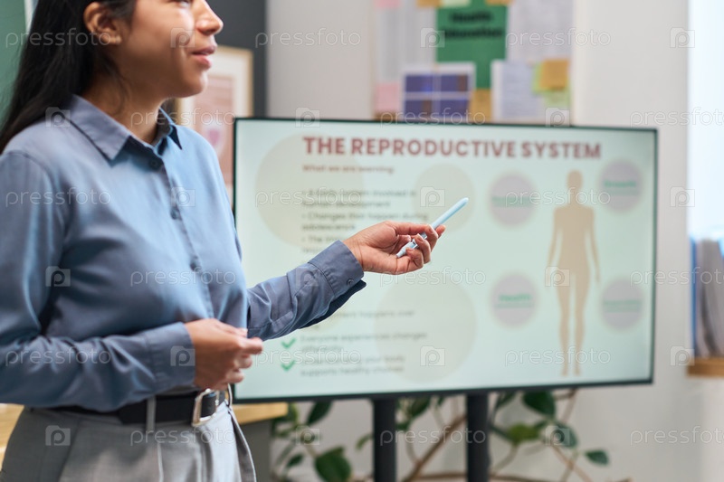 Молодая взрослая испаноязычная женщина объясняет репродуктивную систему в классной обстановке