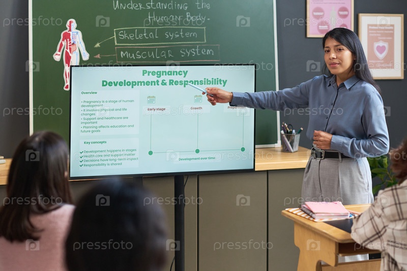 Молодая взрослая испаноязычная женщина преподает развитие беременности различным подросткам